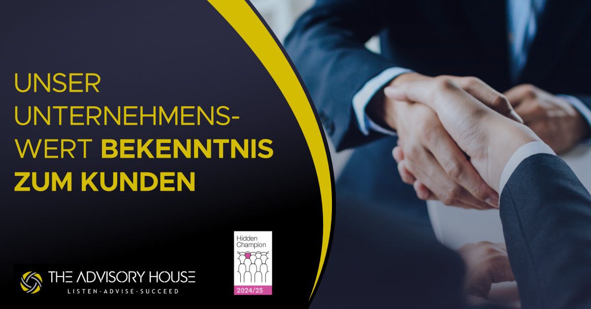 🤝 Das Bekenntnis zum Kunden ist der zweite unserer drei Unternehmenswerte. Zusammen bilden sie das Fundament von The Advisory House, das die Verhaltensweisen und Entscheidungsprozesse unseres Unternehmens definiert und leitet.